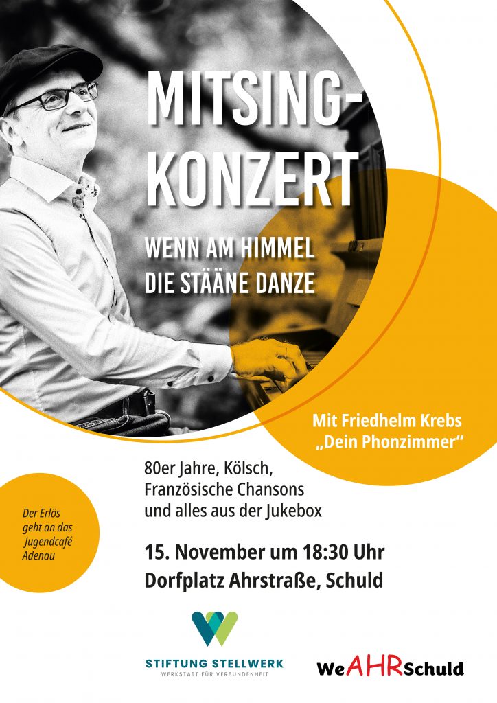 Allgemein, Arbeitskreis Dorferneuerung, Fotos, Freizeit, Veranstaltungen MITSINGKONZERT 2. November 2025 Julia Kläsgen MITSINGKONZERTWenn am Himmel die Stääne danze 15. November um 18:30 UhrDorfplatz Ahrstraße, Schuld Mit Friedhelm Krebs „Dein Phonzimmer“80er Jahre, Kölsch, Französische Chansons und alles aus der Jukebox Der Erlös geht an das Jugendcafé Adenau