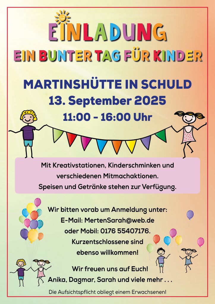 - Mit Kreativstationen, Kinderschminken und verschiedenen Mitmachaktionen. Speisen und Getränke stehen zur Verfügung.