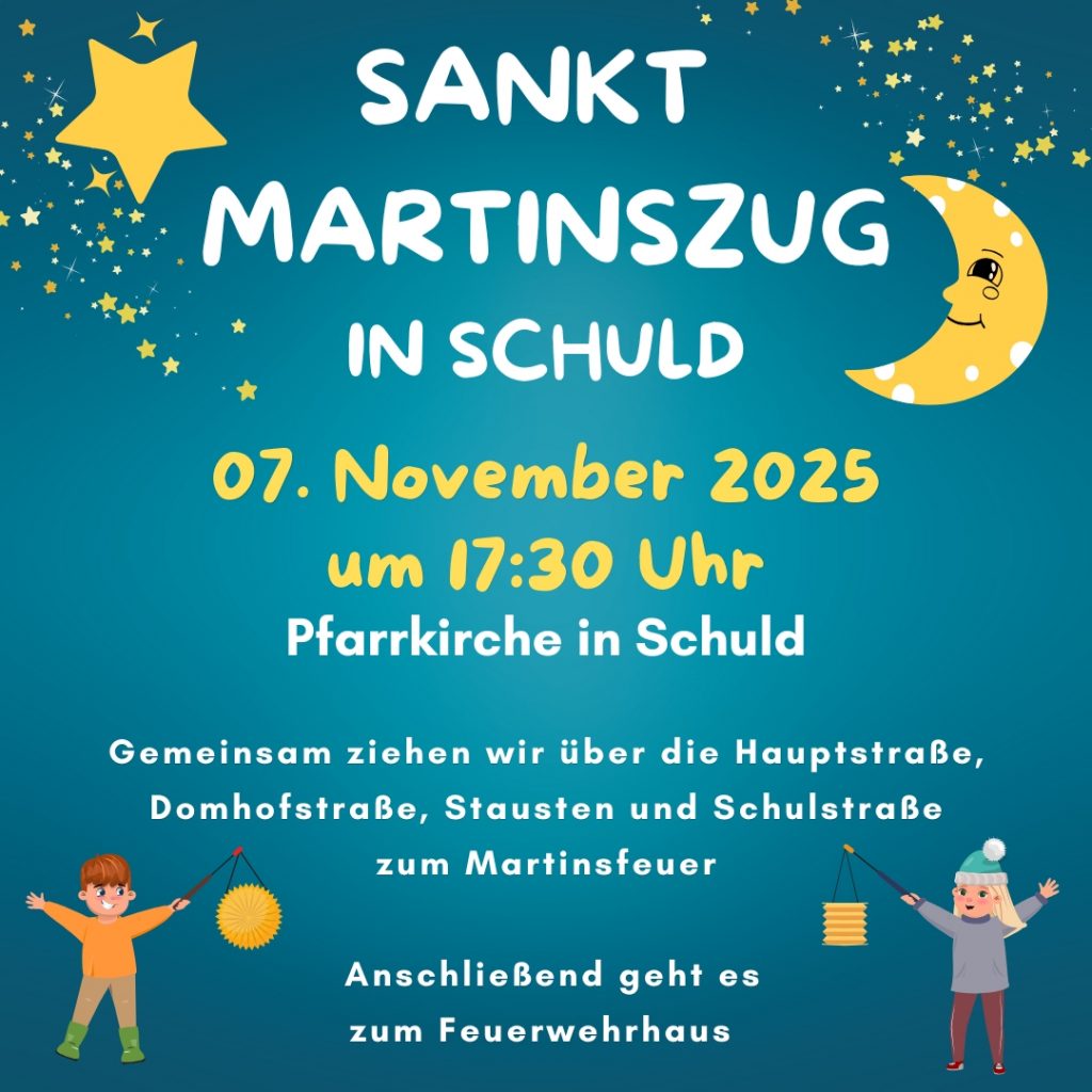 Allgemein, Fotos, Freiwillige Feuerwehr Schuld, Freizeit, Gemeindeverwaltung Schuld, Veranstaltungen SANKT MARTINSZUG in Schuld 16. Oktober 2025 Julia Kläsgen 07. November 2025, 17:30 Uhr Start: Pfarrkirche Schuld Gemeinsam ziehen wir über die Hauptstraße, Domhofstraße, Stausten und Schulstraße zurück zum Martinsfeuer Anschließend geht es zum Feuerwehrhaus