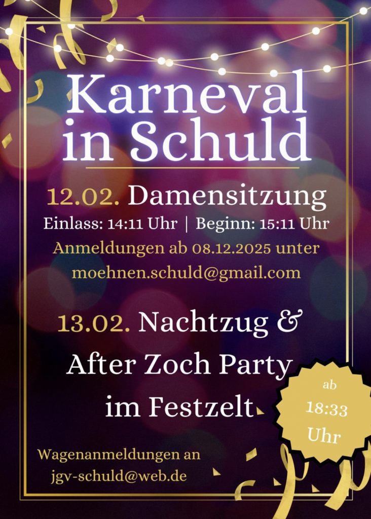 Allgemein, Fotos, Freizeit, JGV Schuld, Karneval, Veranstaltungen Karneval in Schuld 9. Dezember 2025 Julia Kläsgen 12.02.2026DamensitzungEinlass: 14:11 UhrBeginn: 15:11 Uhr Anmeldungen ab 08.12.2025 unter:E-Mail: moehnen.schuld@gmail.com 13.02.2026Nachtzug & After Zoch Party im Festzeltab 18:33 UhrWagenanmeldungen an:E-Mail: jgv-schuld@web.de Screenshot